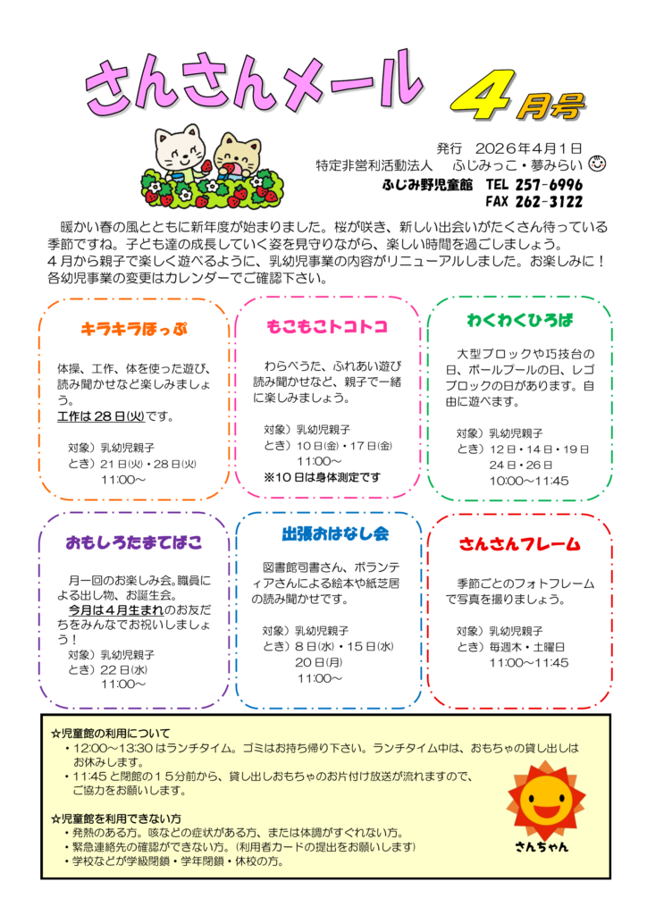 じどうかんだより(立春号) 2023 2/17 じどうかんだより 2023年2月17日 じどうかんだより2023年立春号ダウンロード じどうかんだより じどうかんだより(3学期号) じどうかんだより(春休み直前号) 関連記事 ふじみ野児童館だより3月・4月・5月(春休み号) 2026年3月16日 ふじみ野児童館だより 2月・3月(冬号) 2026年1月26日 ふじみ野児童館だより 令和7年12月・1月(冬休み号) 2025年12月15日 ふじみ野児童館だより 令和7年10月・11月(晩秋号) 2025年10月15日 ふじみ野児童館だより 令和7年9月・10月(秋号) 2025年8月26日 ふじみ野児童館だより 令和7年7月(夏休み号) 2025年7月11日 ふじみ野児童館だより 令和7年5月(新緑号) 2025年5月9日 ふじみ野児童館だより 令和7年4月(祝新1年生入学号) 2025年4月5日