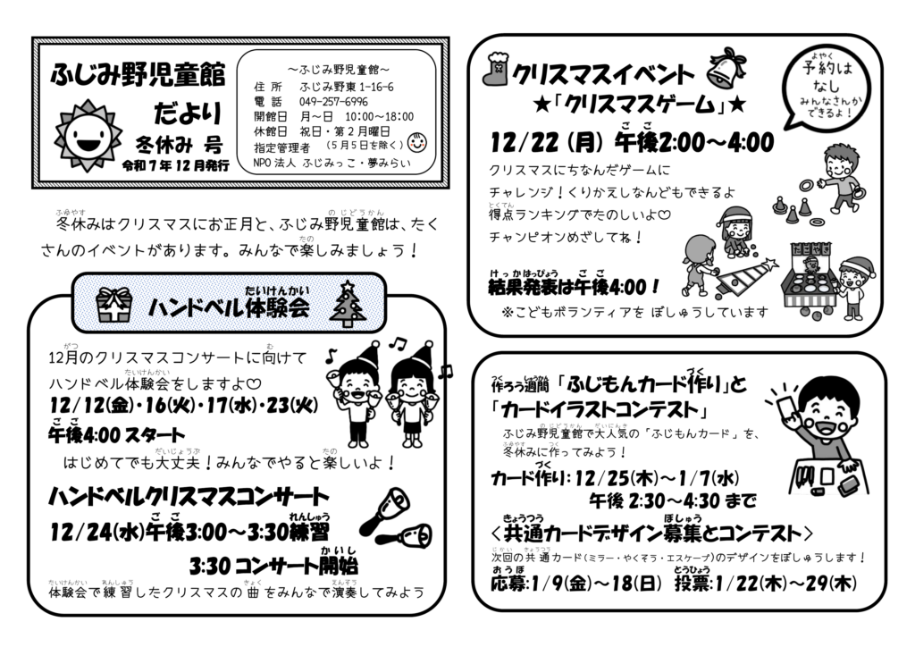 「ハンドベルクリスマスコンサート」に向けて、子どもたちによる「子ども会議」を行ないました。子どもたちは積極的に意見を交わし、曲決めや、パートの音を決めました。コンサート前の挨拶文も子どもたちで考え、コンサート当日には大勢の来館者の前で読み上げることが出来ました。