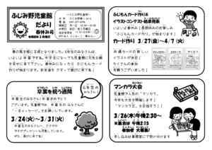 じどうかんだより(令和6年 梅雨号) 2024 6/26 じどうかんだより 2024年6月26日 R06ふじみ野児童館だより(梅雨号)ダウンロード じどうかんだより じどうかんだより(令和6年 新学期号) じどうかんだより(令和6年 夏休み号) 関連記事 ふじみ野児童館だより3月・4月・5月(春休み号) 2026年3月16日 ふじみ野児童館だより 2月・3月(冬号) 2026年1月26日 ふじみ野児童館だより 令和7年12月・1月(冬休み号) 2025年12月15日 ふじみ野児童館だより 令和7年10月・11月(晩秋号) 2025年10月15日 ふじみ野児童館だより 令和7年9月・10月(秋号) 2025年8月26日 ふじみ野児童館だより 令和7年7月(夏休み号) 2025年7月11日 ふじみ野児童館だより 令和7年5月(新緑号) 2025年5月9日 ふじみ野児童館だより 令和7年4月(祝新1年生入学号) 2025年4月5日
