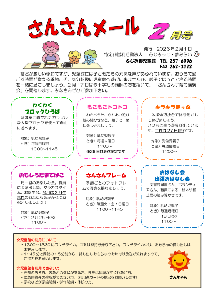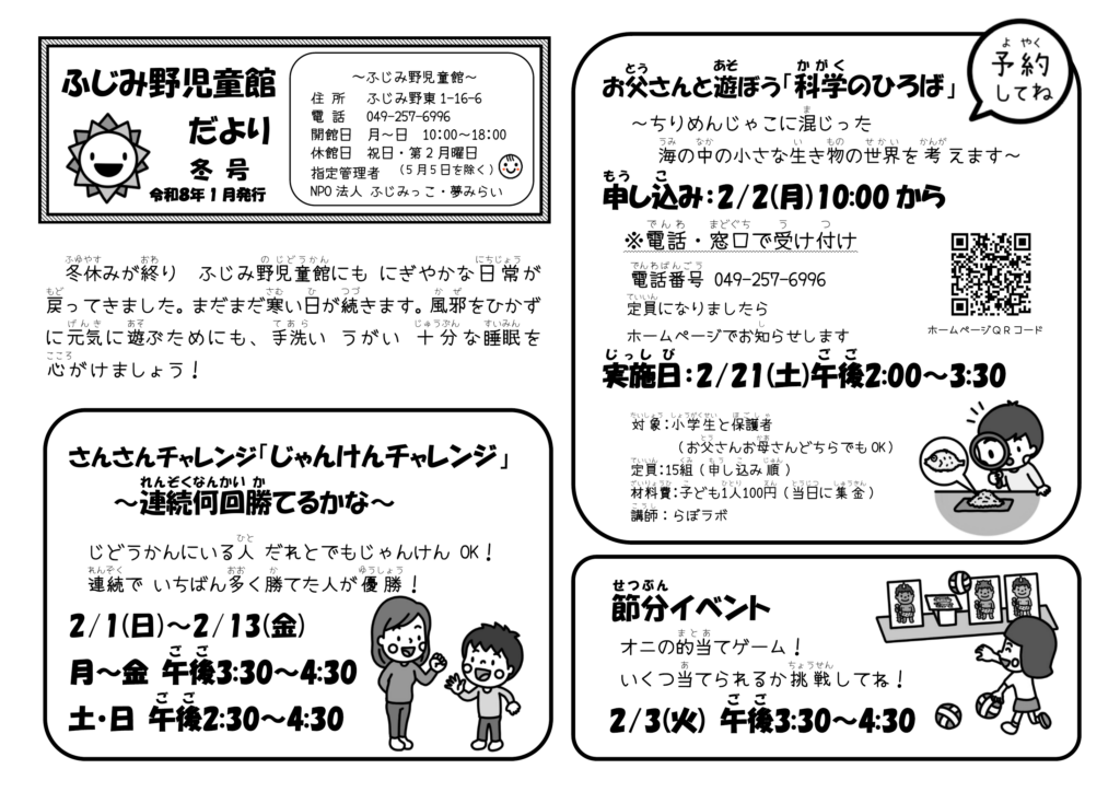 ふじみ野児童館だより 令和7年1月(冬号) 2025 1/15 じどうかんだより 2025年1月15日 ふじみ野児童館だより令和7年1月(冬号)ダウンロード じどうかんだより じどうかんだより(令和6年 冬休み号) ふじみ野児童館だより 令和7年3月(春休み号) 関連記事 ふじみ野児童館だより 令和7年12月・1月(冬休み号) 2025年12月15日 ふじみ野児童館だより 令和7年10月・11月(晩秋号) 2025年10月15日 ふじみ野児童館だより 令和7年9月・10月(秋号) 2025年8月26日 ふじみ野児童館だより 令和7年7月(夏休み号) 2025年7月11日 ふじみ野児童館だより 令和7年5月(新緑号) 2025年5月9日 ふじみ野児童館だより 令和7年4月(祝新1年生入学号) 2025年4月5日 ふじみ野児童館だより 令和7年3月(春休み号) 2025年3月24日 じどうかんだより(令和6年 冬休み号) 2024年12月12日