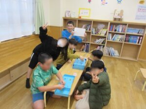 大学生ボランティアのうるふさんたちが作ったボール運びレースはボールを使ったミニゲームにチャレンジするもので、柔軟な発想が面白く人気がありました。子ども達は真剣にゲームにチャレンジしたが、思い通りの結果が出ずに悔し涙を浮かべる子もいた。