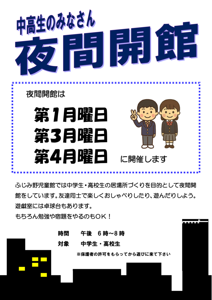 夜間会館のお知らせ 2026 2/16 未分類 2026年2月16日 毎月、第1、第3、第4月曜日は中高生の居場所として夜8時まで開館しています。申し込みは必要ありませんが、必ず保護者の許可を得て来館してください。 未分類 関連記事関連する記事はまだ見つかりませんでした。