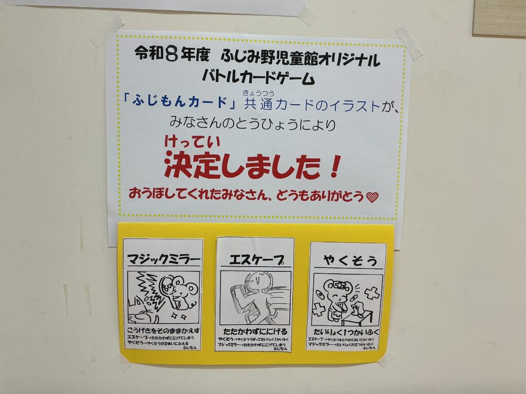ふじもんカードの共通カードである「エスケープ」「やくそう」「マジックミラー」の3種類の絵柄を募集しました。募集期間中、22人の小学生から応募がありました。掲示されたデザインに対し、101人の小中高生が投票を行いました。こうして子どもの意見を反映して選ばれた3種類のカードは、次回の「ふじもん工作」で使用される予定です。