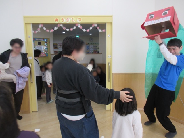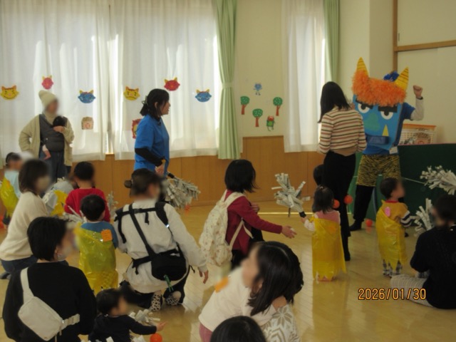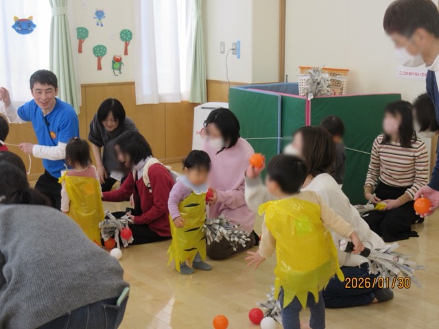30日は、節分に向けて「トラ柄の鬼の服」と「新聞紙の金棒」の工作を行いました。工作の後は、ボールを節分の豆に見立てた「豆まき遊び」を楽しみました。鬼の服を着て準備万端の子どもたちは、カラフルな壁鬼や、紐で吊るしたくるくる鬼、そして最後に登場した大きな鬼に向かって、親子で一生懸命に豆のボールを当てて遊んでいました。