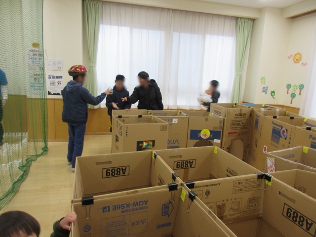 お正月遊びは、児童館オリジナルのおみくじを引いたり、職員が演じる獅子舞が登場したりして雰囲気を盛り上げました。幼児室には紅白のボールプールを用意しました。遊戯室にはダンボール迷路や紙コップタワーを用意し、普段とは違った遊びをしました。