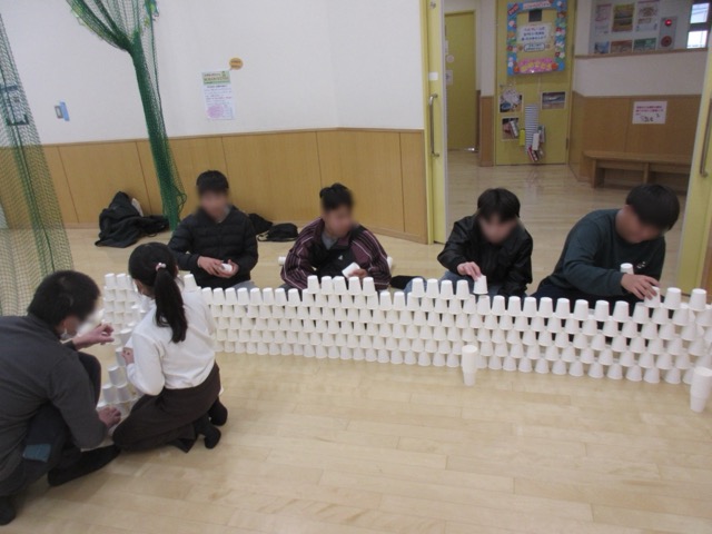 紙コップタワー作りは、幼児親子から小学生、中学生までが夢中になって取り組んでいました。中学生男子が作っていたタワーに、小学生女子が「一緒にやっていい?」と尋ねると、中学生は「いいよ」と快く仲間に入れてあげていました。異年齢の子どもたちが関わり、共同して大きな一つの作品を作り上げることができました。