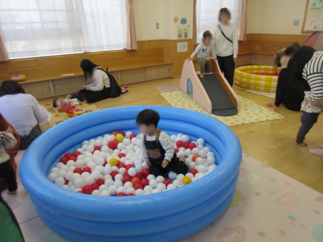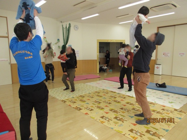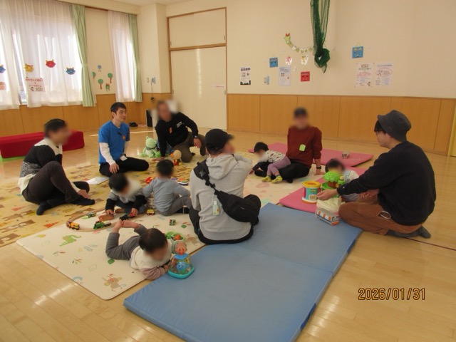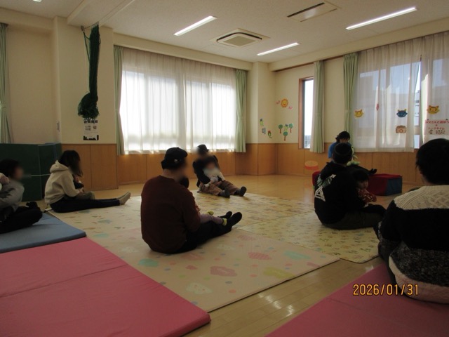 キラキラほっぷでは、「おにはそと ふくわうち」の手遊びや、「おてんとサンサン体操」の歌に合わせて、親子で元気に体を動かしました。会の後半には、巧技台や大型ブロック、ラバーリング、トンネルなどを使った自由遊びを楽しみました。