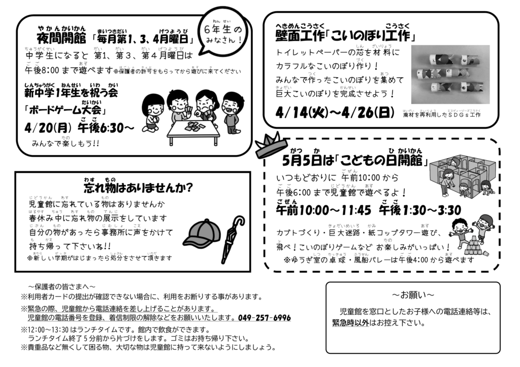 ふじみ野児童館だより3月・4月・5月(春休み号) 2026 3/16 じどうかんだより 2026年3月16日 ふじみ野児童館だより3月・4月・5月(春休み号)ダウンロード じどうかんだより ふじみ野児童館だより 2月・3月(冬号) 関連記事 ふじみ野児童館だより 2月・3月(冬号) 2026年1月26日 ふじみ野児童館だより 令和7年12月・1月(冬休み号) 2025年12月15日 ふじみ野児童館だより 令和7年10月・11月(晩秋号) 2025年10月15日 ふじみ野児童館だより 令和7年9月・10月(秋号) 2025年8月26日 ふじみ野児童館だより 令和7年7月(夏休み号) 2025年7月11日 ふじみ野児童館だより 令和7年5月(新緑号) 2025年5月9日 ふじみ野児童館だより 令和7年4月(祝新1年生入学号) 2025年4月5日 ふじみ野児童館だより 令和7年3月(春休み号) 2025年3月24日